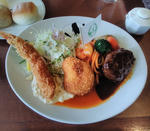 サラダ、エビフライ、カニクリームコロッケ、ハンバーグ、ナポリタン