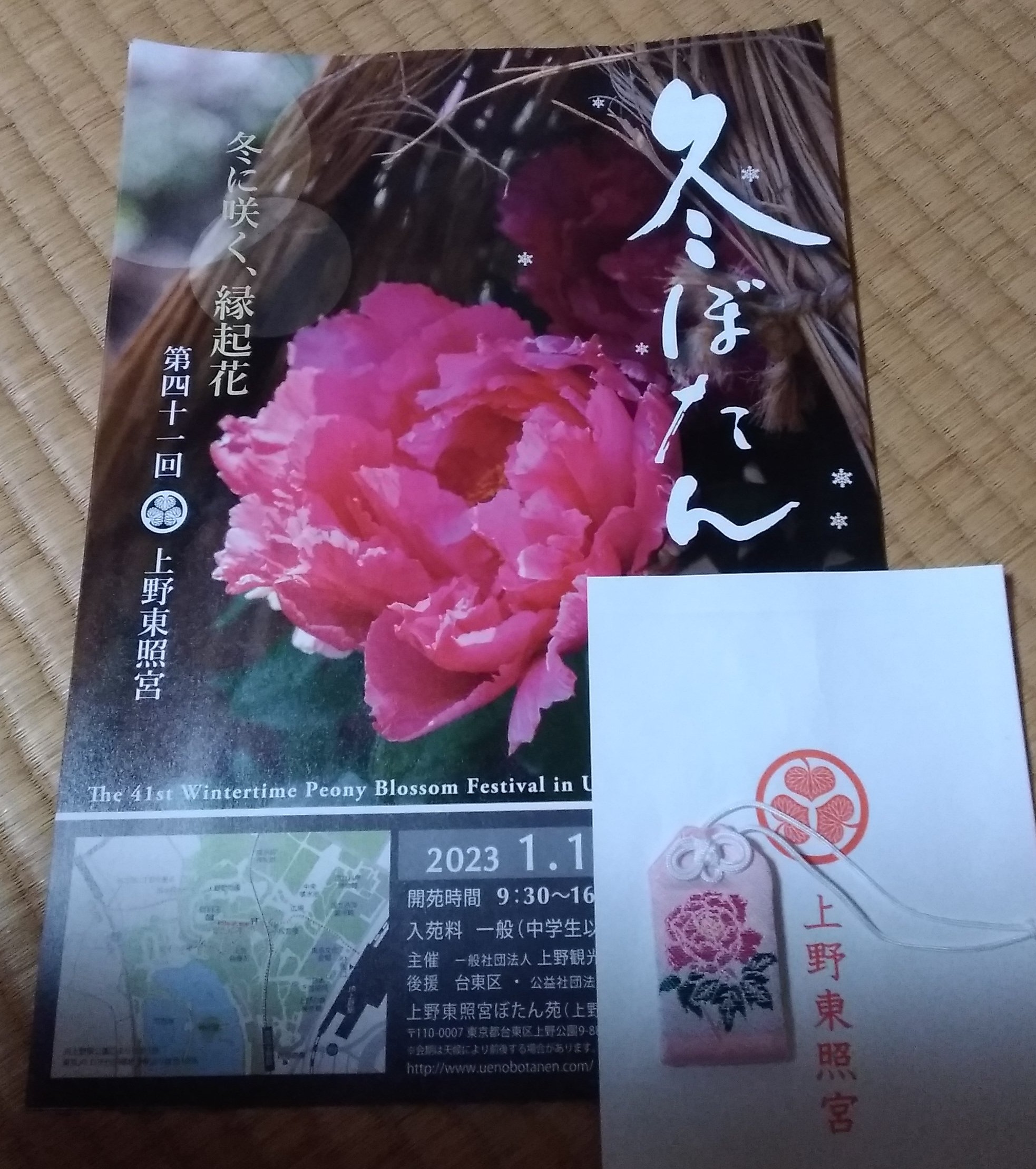牡丹苑で貰ったパンフと、東照宮で買った、牡丹お守り。